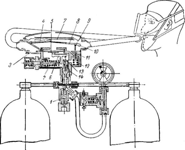 1 – вентиль; 2 и 12 – пружине; 3 — резиновый клапан выдоха; 4 и 6 – рычаг; 5 и 8 – мембрана; 7 – дыхательный автомат; 9 — винт; 10 — оси 11 – шток автомата; 13 – толкатель; 14 – клапан.
