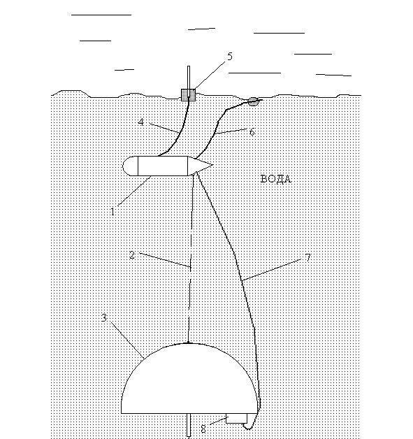 Внутренний объём базы заполняется воздухом и база всплывает на якорьтросе 9. При этом муфта 12 движется вверх вместе с тросом 11, пока не упрётся в корпус ствола 1. База наполняется воздухом и спицы 5 принимают горизонтальное положение, поворачиваясь в шарнирах 6.