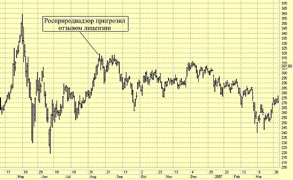 Рис. 1. Стоимость акций РАО «Газпром» на ММВБ в 2006 г.