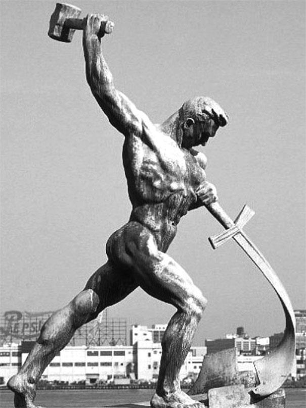 Скульптура Евгения Вучетича «Перекуем мечи на орала», установленная у здания ООН в Нью-Йорке (США)