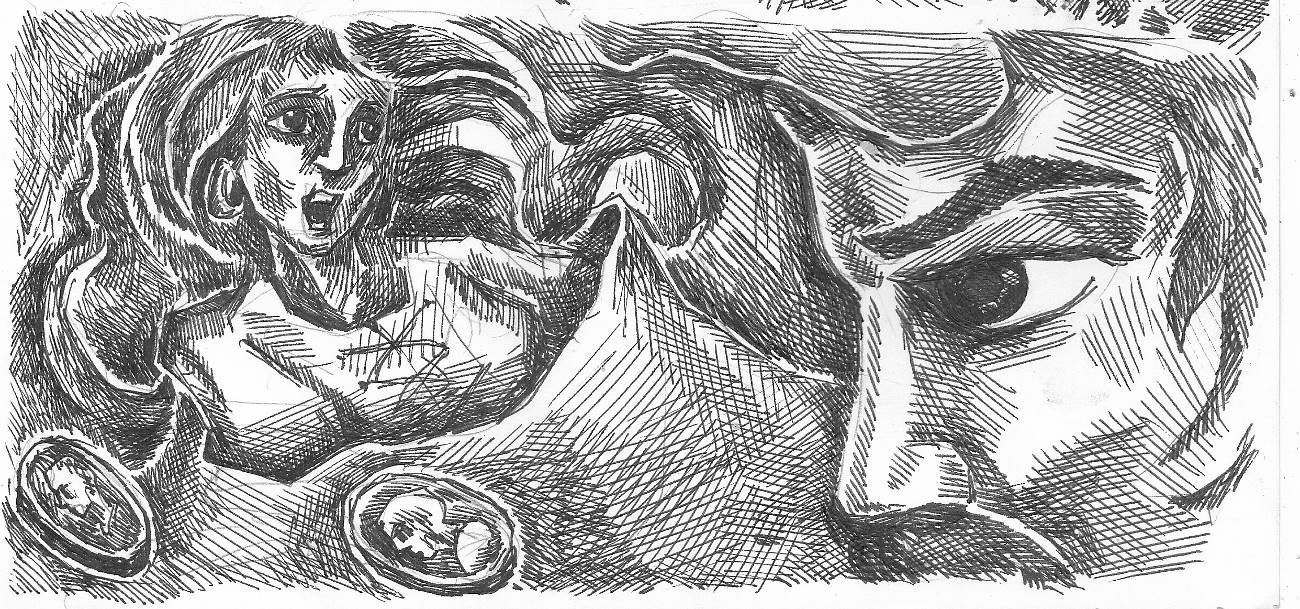 Женщина тут же запустила свои руки в россыпь золотых монет, но вынуть их не смогла, как ни дёргалась и ни вырывалась. Наоборот, края мешочка всё теснее сжимались вокруг её рук, как зубы зверя, сам он начал расти и постепенно словно «заглатывать» руки всё глубже и глубже.