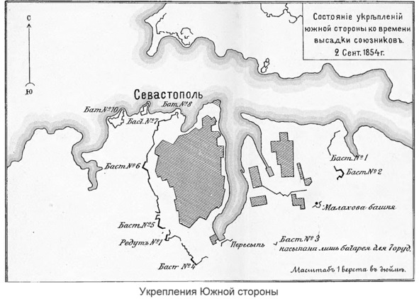 Южные укрепления возводились по проекту 1837 г. – 8 бастионов, соединённых между собой оборонительными стенами общей протяжённостью до 7 вёрст. Но работы были выполнены только частично – VII бастион у батареи №8; оборонительная стенка, без рва и банкета, облегавшая город и Корабельную слободку; 3 оборонительных казармы позади сооружённых впоследствии I, V и VI бастионов; 2-ярусная Малахова башня с круглым гласисом. Созданные оборонительные сооружения прикрывали не более четверти всей окружности города, остальные же три четверти были совершенно открыты. Пушечными выстрелами эти укрепления могли быть разбиты с самого дальнего расстояния.