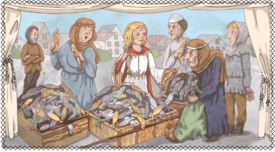 Каждый день принцесса Альбертина отправлялась на Старый рынок за рыбой к торговке фрау Аделите. Сопровождал принцессу Альбертину министр Олдрик, который нёс большую плетёную корзину для рыбы. У фрау Аделиты всегда имелась самая лучшая и свежая рыба на Старом рынке вольного города Киля, и у неё было много постоянных покупателей.