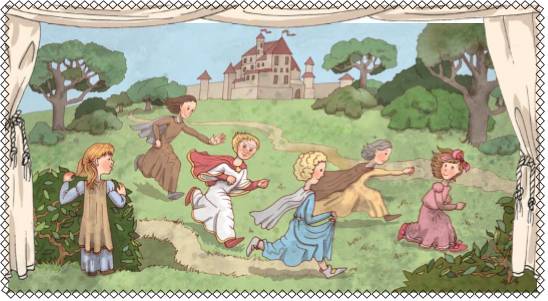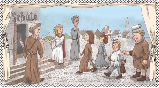 Прежде дети обычных людей в школе не учились, а помогали по работе и дому родителям. Даже если были совсем маленькими. Учиться могли лишь дети знатных людей. Принцессу Альбертину и её фрейлин в королевском замке обучали наукам монах Родерик, министры Олдрик и Фридрих, звездочёт Бернард, а также фрау Матильда. Монах Родерик учил письму и объяснял мироустройство. Министр Олдрик, рассказывая о разных странах и морях, помогал постигать географию, а министр Фридрих – счётное дело. Звездочёт Бернард прививал любовь к астрономии, с её далёкими и неведомыми мирами. Фрау Матильда обучала красивым манерам, а ещё тому, как жить в строгости. Принцессе Альбертине с фрейлинами Эмили и Катрин учиться было скучно. Им хотелось собирать цветы, мечтать и играть в игры, а вместо этого приходилось заниматься грамматикой и арифметикой, а также терпеть строгие наставления фрау Матильды.