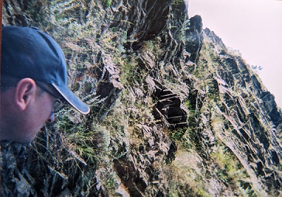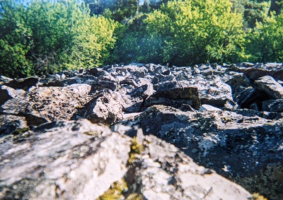 Как кролики к удаву, подплываем к берегу и разбиваем лагерь. Только что прошедший дождь превратил приготовление пищи в серьезное металлургическое занятие, один из нас нагнетал воздух лодочным насосом, второй, направляя шланг в разные стороны, поднимал в воздух пепел, мелкий мусор, чай, соль, перец и лавровый лист. После приготовления пищи, идем осматривать мрачную достопримечательность. Когда-то несколько прибрежных скал рассыпались на кубы, октаэдеры, тетраэдеры и гексаэдеры, оставшиеся скалы подпирают со всех сторон их прах и по внешнему виду готовы и сами в ближайшее время рухнуть. Идти по этим геометрическим образованьям чрезвычайно опасно, даже самые крупные из них слегка пошатываются, а покрывающий их скользкий мох просто создан для туристического травматизма. В полной мере насладившись инопланетным пейзажем и собственными ловкостью и бесстрашием, решаем заняться добычей пропитания.