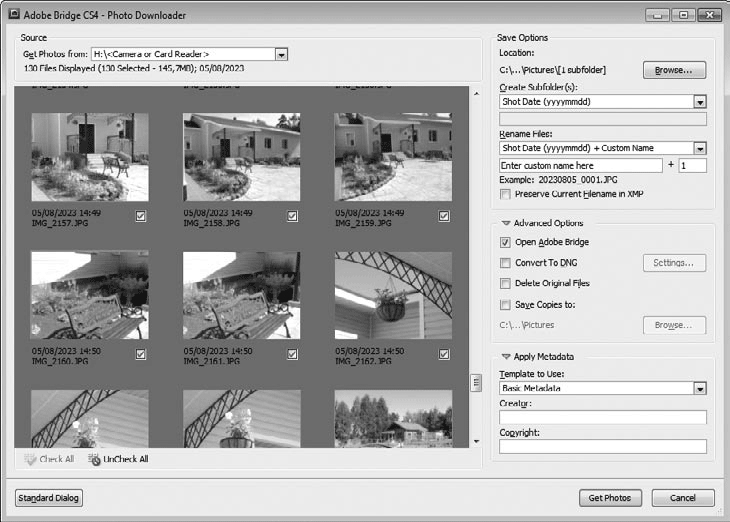 Программа Bridge имеет собственный инструмент импорта снимков с цифровой камеры. При выборе команды меню File → Get Photos from Camera (Файл → Получить снимки с камеры) появляется диалоговое окно Photo Downloader (Загрузчик снимков) (рис. 2.15).