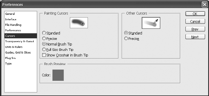 В области Other Cursors (Курсоры других инструментов) вы найдете всего два варианта: Standard (Стандартный) и Precise (Точный). Исходя из описанных выше соображений, рекомендуем остановиться на варианте Precise (Точный).