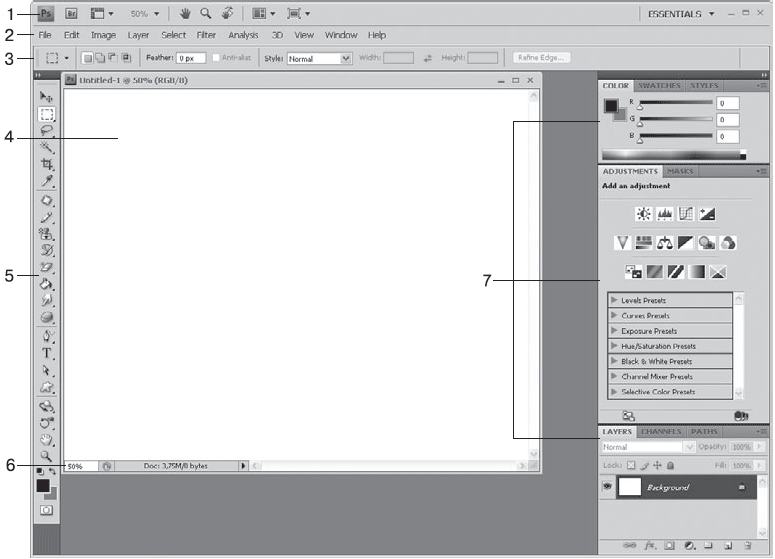 Итак, давайте запустим редактор и внимательно рассмотрим появившееся окно (рис. 4.1). Первое, что бросается в глаза, – отсутствие привычных (по программам от компании Microsoft) панелей инструментов со значками наиболее популярных команд из командного меню. Поэтому опытные пользователи Photoshop советуют как можно быстрее запомнить горячие клавиши и пользоваться только ими. Но это в будущем, а пока попробуем разобраться, что мы, собственно, видим на рисунке.