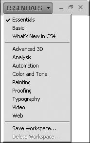 В правом верхнем углу окна программы, рядом с кнопками сворачивания, разворачивания и закрытия окна, расположена кнопка Workspace (Рабочая область). При ее нажатии открывается меню (рис. 4.3), практически аналогичное пункту главного меню программы Window → Workspace (Окно → Рабочая область). В нем собраны команды, предназначенные для быстрого перехода к нужной рабочей области.
