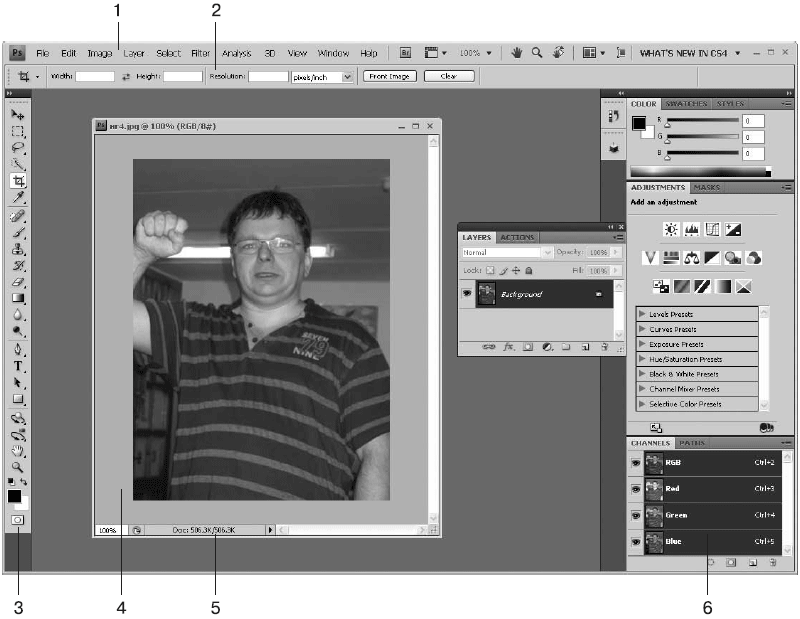 1. Меню программы. Здесь собраны команды Photoshop. Многие из них имеют клавиатурные эквиваленты. Рекомендуем выучить хотя бы самые необходимые. Гораздо легче нажать, например, Ctrl+I, чем отыскать в меню пункт Image → Adjustments → Invert (Изображение → Коррекция → Инвертировать).