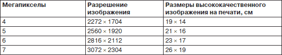 Таблица 3.1. Зависимость максимальных размеров выводимого на печать изображения от разрешения цифровой камеры