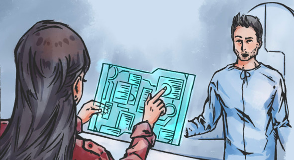 Отец потянулся к кнопке у кровати и нажал на неё. Полупрозрачная голографическая проекция появилась из ниоткуда прямо у изножья кровати. Возник образ миловидной девушки в полный рост. Девушка монотонным голосом произнесла: