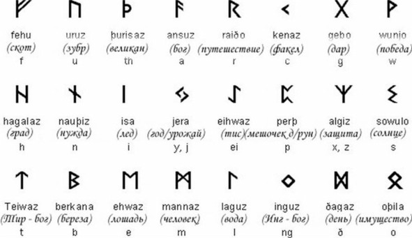 Называют сие чудо – Старший Футарк. Название ФУТАРК – это первые буквы названий первых шести рун – Феу, Уруз, Турс, Ансуз, Райдо, Кано. Привожу краткую табличку всех 24 рун.