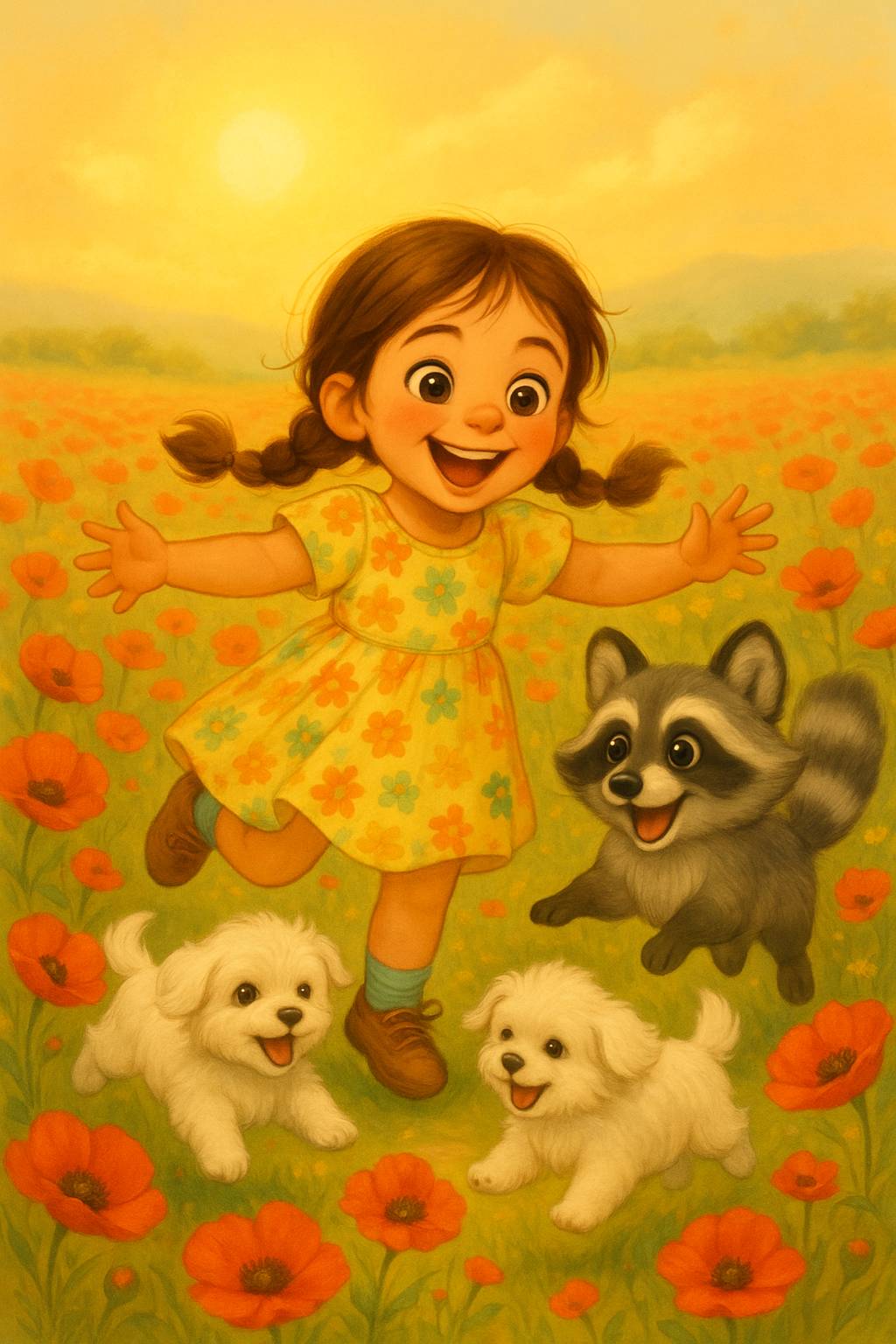 Они устроились на пледе прямо среди поля, как будто стали частью этого алого мира. Мама достала бутерброды, папа налил чай, а Вита – конечно же – достала свой блокнот. На одной из страниц появились первые очертания: маки, Вита, Кико, два щенка, и далеко на фоне – светящийся купол из её воображения. Она не рисовала просто картинку. Она запечатлевала момент силы.