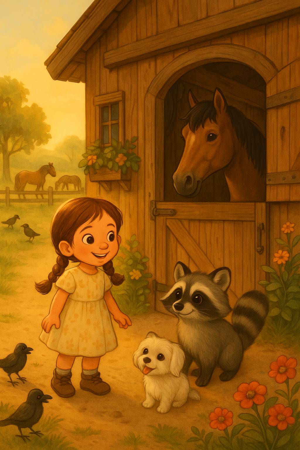 Перед ней раскинулась настоящая маленькая ферма: просторный загон с лошадьми, аккуратные деревянные постройки, а чуть дальше – светлый уютный домик с верандой, откуда доносились ароматы свежего хлеба, тушёных овощей и чего-то, что пахло одновременно пряниками и детством.