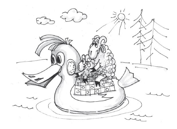 Вокруг него, на надувных рыжих утятах, плавали маленькие барашки со своими родителями. Рядом вынырнул растрёпанный дедушка, потом вынырнул и его рюкзачок. Свой Петя потерял, когда упал в яму.