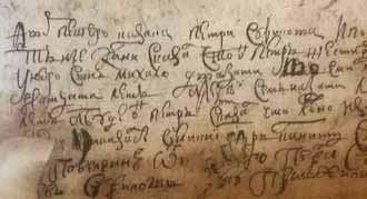 Двор дворянина Ильи Нашивошникова. И он, Илья, под опасением смертные казни сказал: он, Илья, – пятидесяти шести лет. Детей у него: Иван – двадцати семи лет, Федор – четырнадцати лет. Дворовых людей крепосных: Осип – 20 л., Л[еонт]ей 30 л. и закладной [человек] Игнатей 14 л. У Ивана сын Петр – тринадцати недель, дворовой? 35 л. Сын у кего Семен 4 г…. К сей ск[аске по] велению отца своего Ильи Нашивошникова [сын его] Федор Нашивошников руку приложил.
