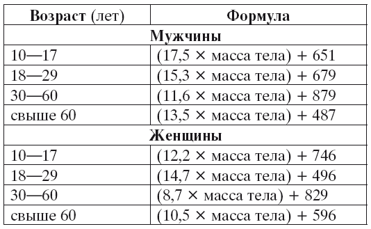 65,5 + [9,6 х масса тела (кг)] + [1,8 х рост (см)] – [4,7 х возраст (годы)] (женщины).