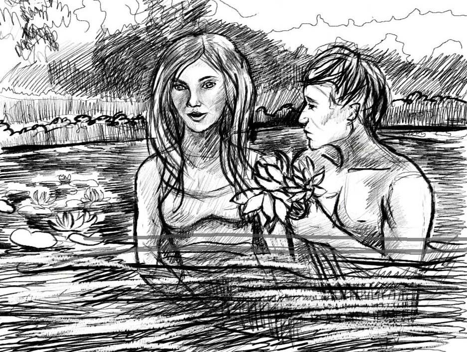 Григорий доплыл до поляны и нарвав букет лилий развернулся к плывущей навстречу жене. Поравнявшись, он нежно положил букет на плечо Полине.