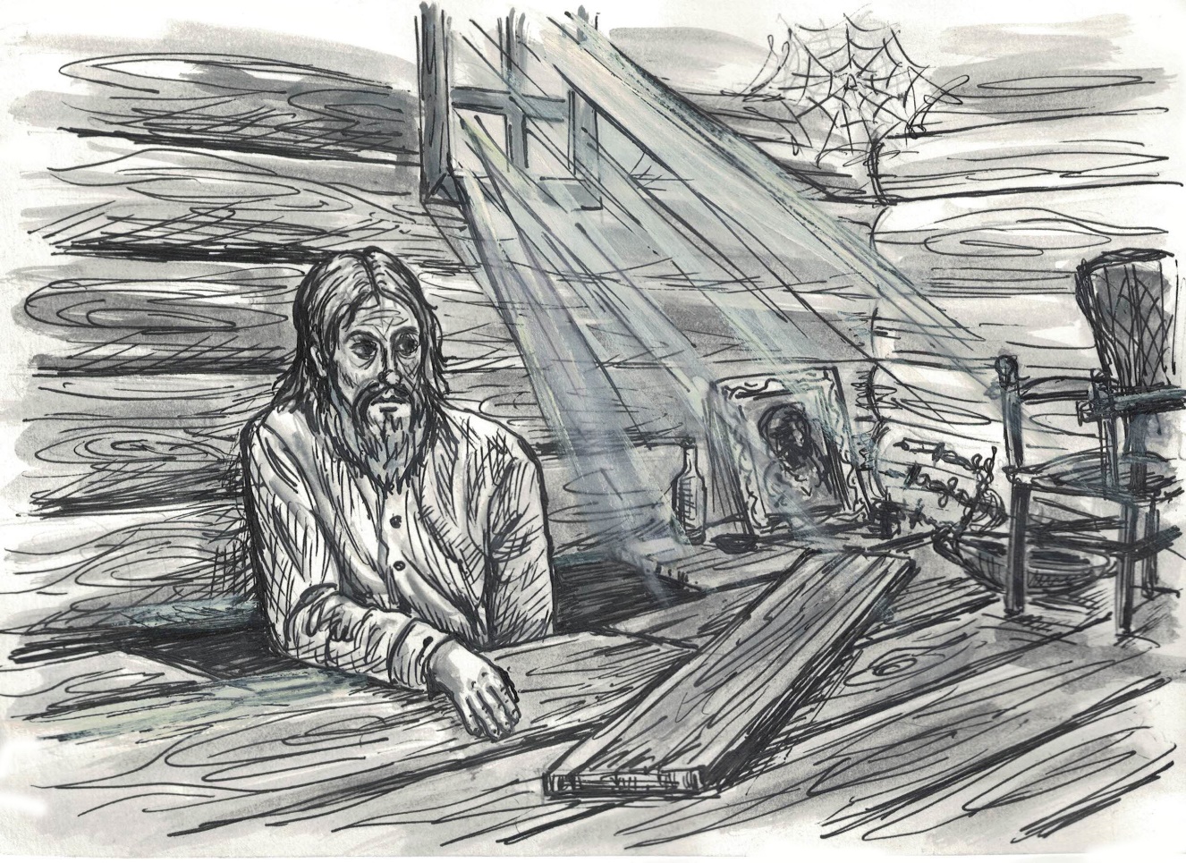 Усевшись на полу, он с тоской остановил свой взгляд на крохотное оконце под потолком комнаты. Бледный лунный свет, струясь через проём, едва заметной дорожкой пробегал по выскобленному тесовому полу.