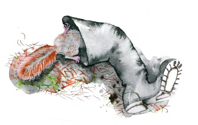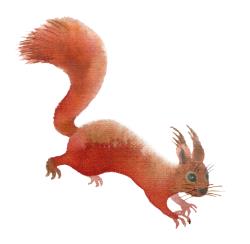 Но вот снова высунулась глазастая головка. Легонько свистнув, зверёк выскочил из-за ёлки, пробежал по земле и спрятался за рюкзаком.