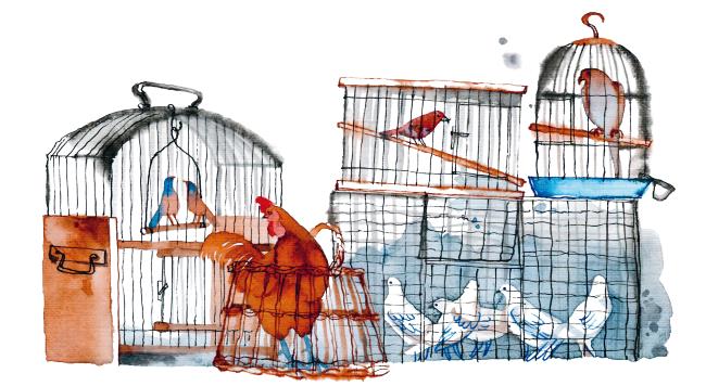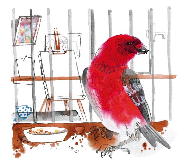 И характер у Капитана был весёлый. Целый день прыгал он по клетке, расшатывал клювом железные прутья или выламывал дверцу. Но больше всего он любил долбить еловые шишки.