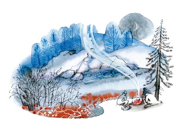 Подстелив на землю лапника, мы разложили спальные мешки, прилегли. Я уткнулся головой в подножие ёлки. Нижние ветки её засохли, на них вырос лишай и свисает к костру, как пакля, как мочало, как белая борода.