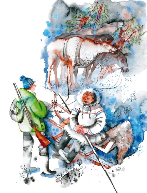 Он сунул мундштук в карман, прошёл ещё немного и увидел на тропе нарты, запряжённые тремя оленями. На нартах сидел человек в резиновых сапогах и в оленьей шубе, расшитой узорами. Это был оленевод Коля, по национальности манси. Он жил с оленями в горах, но иногда заезжал к геологам.