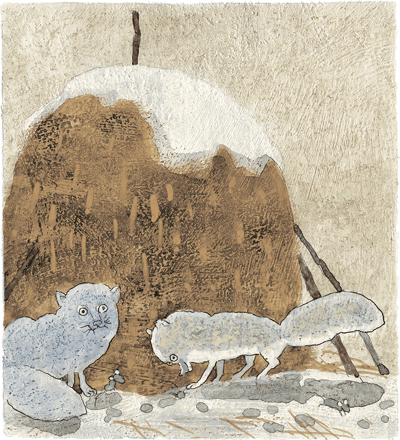 Мышей у стога оказалось полно. Попискивая, шныряли они в перепревшем сене, и Наполеон гонялся за ними, хлопал но снегу лапами и хвостом.