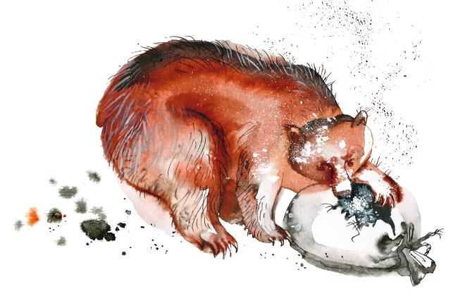 Когтем продрал медведь в мешке дырку, поднял его и стал вытряхивать муку себе на голову, подхватывая её языком. Вмиг голова бурая окуталась мучной пылью и стала похожа на огромный одуванчик, из которого выглядывали красные глазки и высовывался ржавый язык.