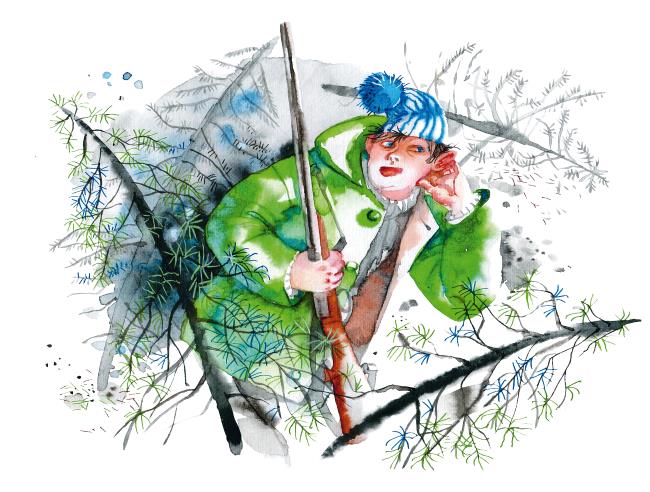 Не спеша пошёл он к лабазу и действительно устраивал на ходу симфонию: стучал дубинкой по стволам деревьев, ломал сучки, выворачивал сухие пихточки, которые крякали и скрежетали, а потом вытащил из ружья патроны и затрубил в стволы, как трубит лось во время гона.