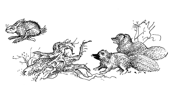Под крик сороки песцы выскочили на вырубку, заваленную ломаными берёзками, выкорчеванными пнями. Здесь под кучей еловых веток спал заяц-беляк. Он гулял-жировал всю ночь и спал теперь крепко и спокойно.