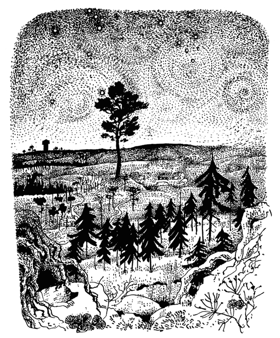 Ого, как высоко забрались они! Далеко видны были тёмные леса, робкие деревенские огоньки за лесами, сизая над огоньками пелена. И совсем уж далеко, как маленький грибок, видна была кирпичная водокачка, отмечающая над деревьями звероферму «Мшага».