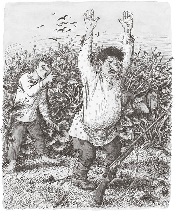 Подушкин с перепугу ружьё уронил, и оно само так шарахнуло, что работники вместе с дробью по кустам рассыпались.