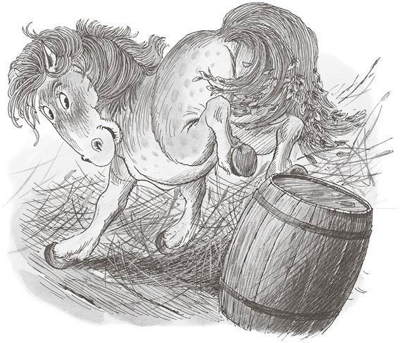 Подушкин проснулся. Смотрит – всё, ну буквально всё, на полу валяется! И во дворе грохот стоит. Это Зелёная Лошадь бочку брыкает. Брыкнёт – и сразу слышит: