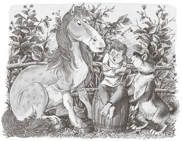 – А я – Конь Вороной, – сказал Конь Вороной. – Такой замок гвоздиком не откроешь. Ты лучше залезай к нам в конюшню через слуховое окно. Надо Зелёную Лошадь развязать. Подушкин её верёвками опутал.