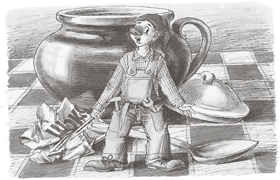 А Подушкин в этот момент крепко спал. Крепко, да не очень. И снилась ему Зелёная Лошадь. И такая она была красивая, что Подушкин вдруг полюбил эту Лошадь изо всех сил. Вот как бывает во сне. Полюбил Подушкин Зелёную Лошадь и завертелся. И до того он довертелся, что самая маленькая подушечка (в которой гирька) свалилась и ударилась об пол. А на полу медный таз лежал. Загремел таз и подскочил от удара. А мыши, которые по полу бегали, от страха запутались в шнурке, который со стола свисал. Шнурок вниз поехал и зацепил кастрюлю с гороховым супом. Кастрюля свалилась, и такой тут начался грохот, что тарелки с полок попадали. И вообще тут всё начало падать: