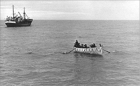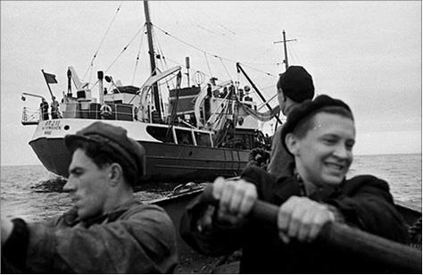 Рандеву состоялось под вечер. Маленькая черная точка на прояснившемся горизонте постепенно вырастает до размеров нормального корабля, и еще через полчаса, после манипуляций со шлюпкой, приплясывающей на свинцовой зыби, в Мурманск уходит радиограмма: «Корреспондент «Огонька» принят на борт».