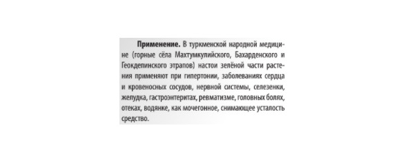 По [64]: лист, прием по 0.2 г, в день не более 0.8 г, равно по действию белладонне, судорожные и воспалительные страдания дыхательных, пищеварительных и мочеполовых органов. По [ВО]: семена – антиглистное.