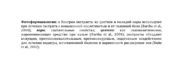 Белая акация (Робиния), Robinia pseudoacacia – разводимое; [Шелепова Ольга Владимировна и др, 2015]: апигенин и акацетин – в листьях; количество общего кремния содержится в БА около 0.8; листья обладают вяжущим, противовоспалительным, противовирусным и седативным эффектом; наличие ксибензойной и оксикоричной кислот в листьях и цв, а также – флавоноиды, флавонолы – рутин, кемпферол и кверцетин.