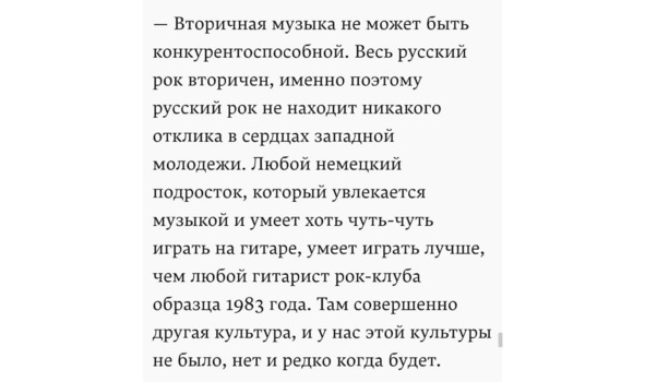 Влияние на российское общество как классической музыки, так и элитарной поэзии в наши дни минимально. Остаётся лишь ужасаться, какое влияние на музыкантов оказала наша текущая действительность, чтобы они написали такие поп-песни. И этими вот песнями, в свою очередь, формировали, через слова песен, словесную среду, образы, сильно влияющие на умы и действительность. Я не переношу такие «песни у костра», где поются песни «Би-2», «Мумий Тролль», «Агата Кристи» etc. А также всякая там бременскомузыканщина. У костра я люблю солнечнобардовские душевные песни. Соответственно, и никогда не слушаю каверистов, у которых весь репертуар – как раз из экс-популярных поп-песен. Вот пример до сих сохраняющейся их популярности. Уличные каверисты, слушателей около 200 человек, много молодёжи – и как дружно люд подпевает, зная наизусть все эти песни! Вот запись: https://dzen.ru/video/watch/665a173fd68e174516af480d
