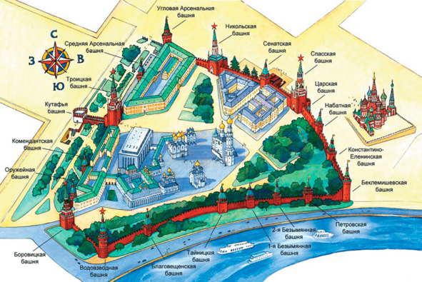 Московский Кремль, самая крупная из сохранившихся крепостей Европы, расположен на Боровицком холме, на более высоком левом берегу Москвы-реки, в том месте, где в нее впадает река Неглинная. В плане Кремль представляет собой треугольник неправильной формы площадью 27,7 гектара, окруженный мощным стенами из красного кирпича с башнями. Южная стена обращена к главной реке российской столицы, северо-западная – к Александровскому саду, восточная – к Красной площади.