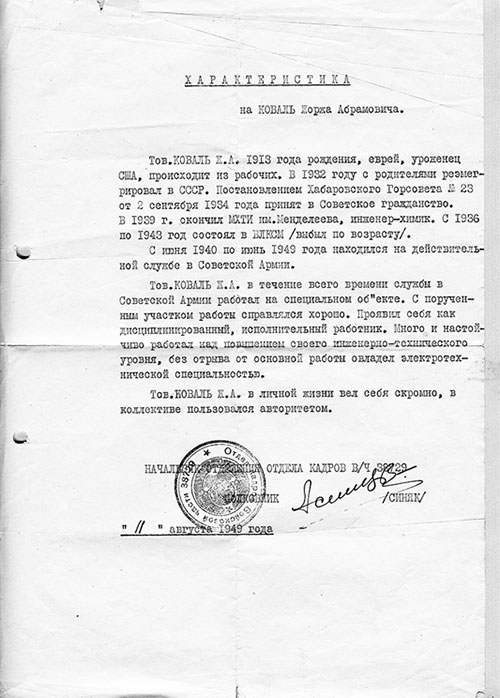 11.01. Характеристика на Ж. А. Коваля из ГРУ от 11 августа 1949 г.[8]