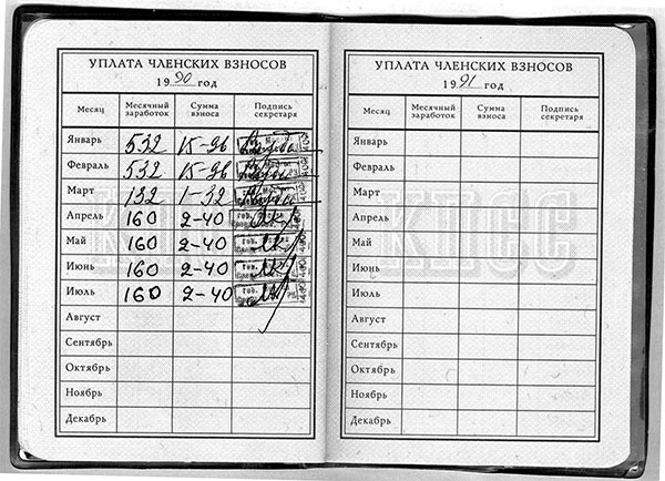 Это зафиксировал его партийный билет. Из него видно время выхода Жоржа из КПСС. Жорж, как дисциплинированный член партии, всегда платил взносы ежемесячно. И вот последняя из заполненных страниц «Уплата членских взносов»: