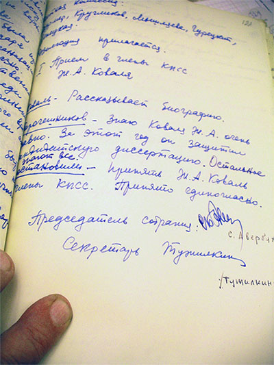 «Коваль – рассказывает биографию. Торочешников – Знаю Коваля Ж. А. очень давно. За этот год он защитил кандидатскую диссертацию. Остальное знают все. Постановили – принять Ж. А. Коваля в члены КПСС. Принято единогласно».[50]