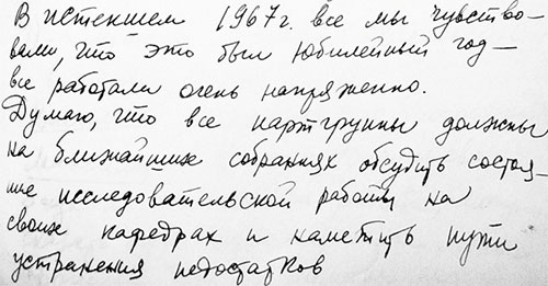 «В истекшем 1967 г. все мы чувствовали, что это был юбилейный год – все работали очень напряжённо. Думаю, что все партгруппы должны на ближайших собраниях обсудить состояние исследовательской работы на своих кафедрах и наметить пути устранения недостатков».[63]