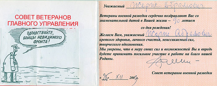 11.32. Поздравление Ж. А. Ковалю с 90-летием от Совете ветеранов военной разведки.[66]