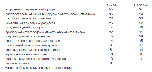 Стоит обратить внимание на явное разделение преимущественно «наших» и преимущественно «общих» (точнее, «чужих») проблем. Наркомания, падение рождаемости, экономический кризис, локальные конфликты – то, что беспокоит прежде всего нас; причины не требуют пояснения («глобальный экономический кризис» для нас – это август 1998-го). Загрязнение среды, природные катастрофы, мировые войны, опасность генетических изменений, перенаселение – это, скорее, «их» проблемы. Общими (одинаково важными) остаются СПИД, терроризм, нищета и голод. Довлеет дневи злоба его…