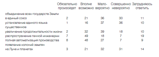 Распространенные представления о наступающем столетии, как и следовало ожидать, оказываются довольно примитивными. В них обычно используется один из двух приемов. Либо допускается, что «там», за воображаемой гранью веков, – примерно то же самое, что и здесь (продолжение известного), либо предполагается, что «там» все иначе (отрицание известных порядков, реализация «запредельных» надежд, всеобъемлющая катастрофа или что-то в этом роде). Сейчас явно преобладают ожидания первого, «актуалистического» типа. Ждут дальнейших улучшений там, где они наметились, верят в технику и медицину (между прочим, довольно оптимистически смотрят на генную инженерию, вопреки преобладающему тону СМИ), но не в утопии и перевороты.