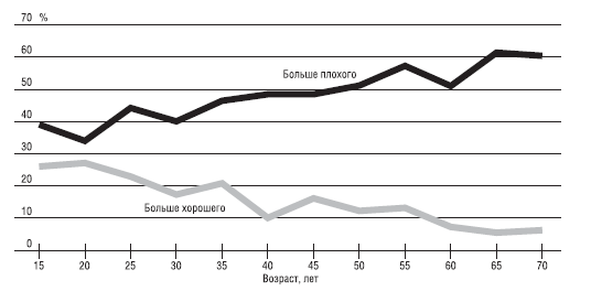 Вопрос о том, принесло ли время перестройки больше хорошего или плохого, выявляет иной расклад мнений по возрасту (рис. i). Во всех возрастных группах преобладают негативные оценки, разница лишь в соотношении: до 25 лет они встречаются примерно в полтора раза чаще, чем позитивные, а в старших по возрасту группах – в два, три, четыре и более раз чаще. Самую суровую характеристику время перестройки получает у лиц в возрасте 65–75 лет (отрицательные мнения встречаются в 10–12 раз чаще).